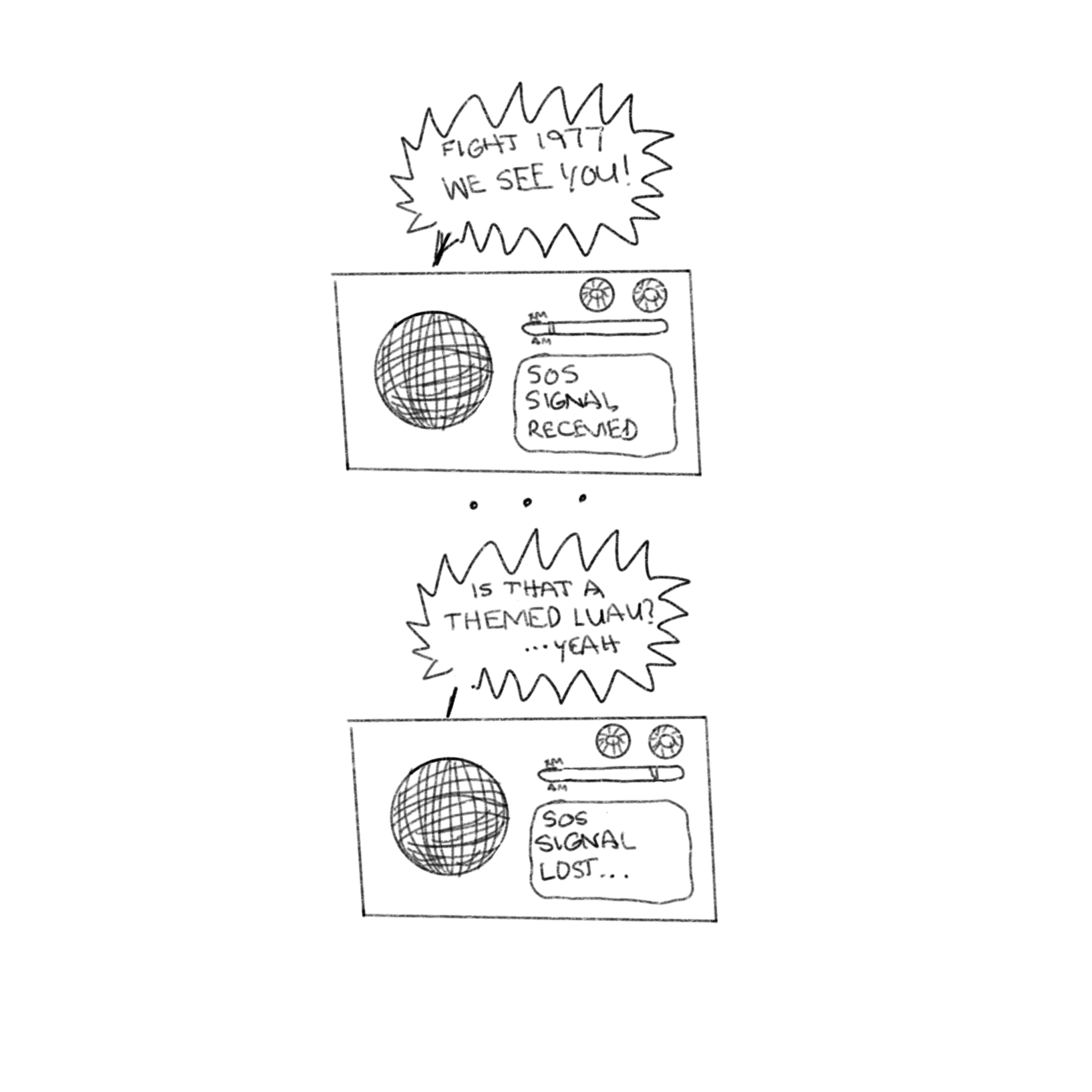 Once every 90 minutes, static crackles over the speakers. A faint voice says they’ve located Flight 1977. The dining room lights flicker dramatically. Sam rushes to the mic: