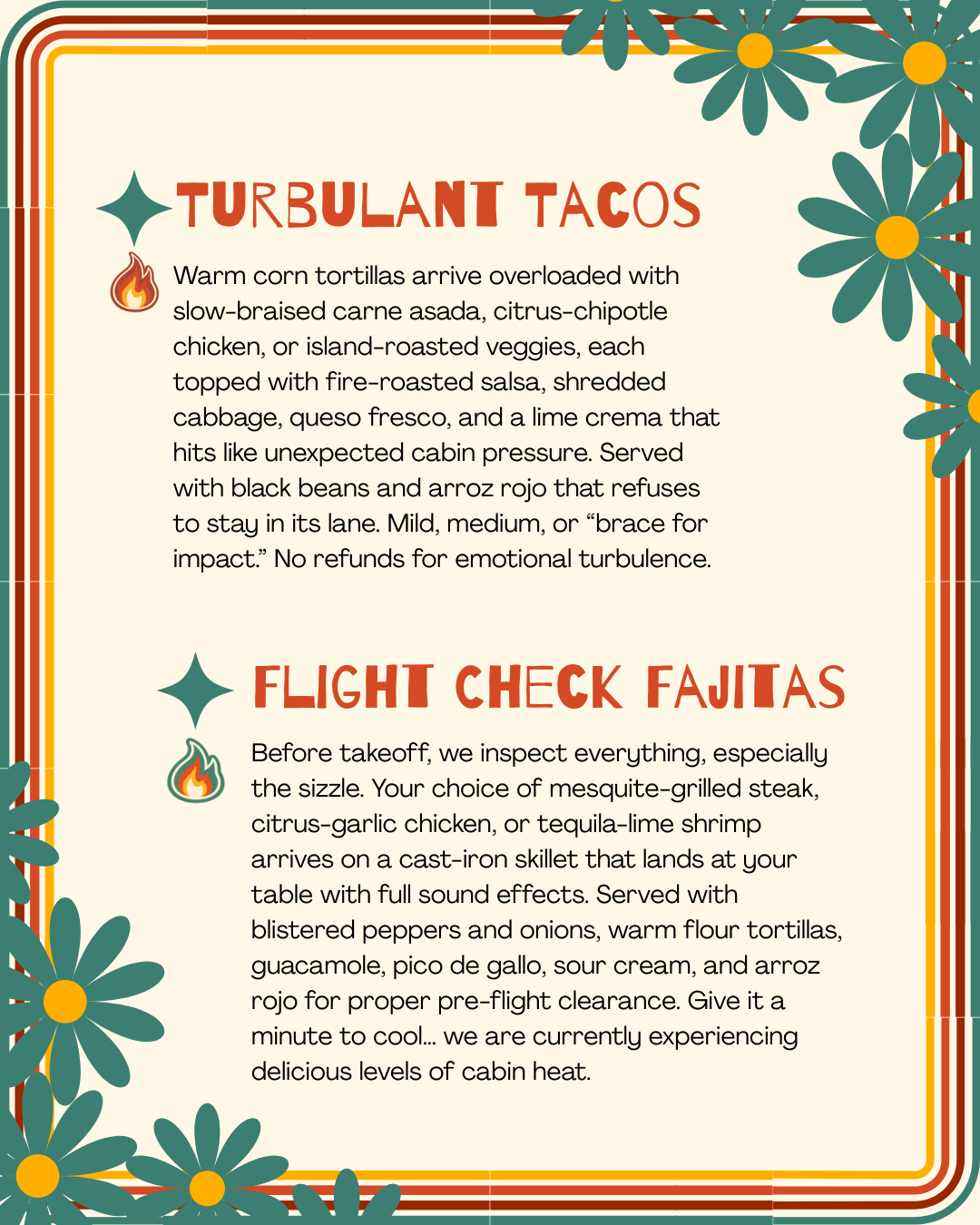 Storytelling extends beyond the built environment and into every detail of the guest experience, including the menu. Through thoughtfully named signature items like the Mayday Margarita and Flight Check Fajitas, the narrative continues at the table. Each dish was designed not only to reflect the restaurant’s playful origin story but to deepen immersion, proving that flavor, humor, and concept can work together to create a memorable and cohesive experience.