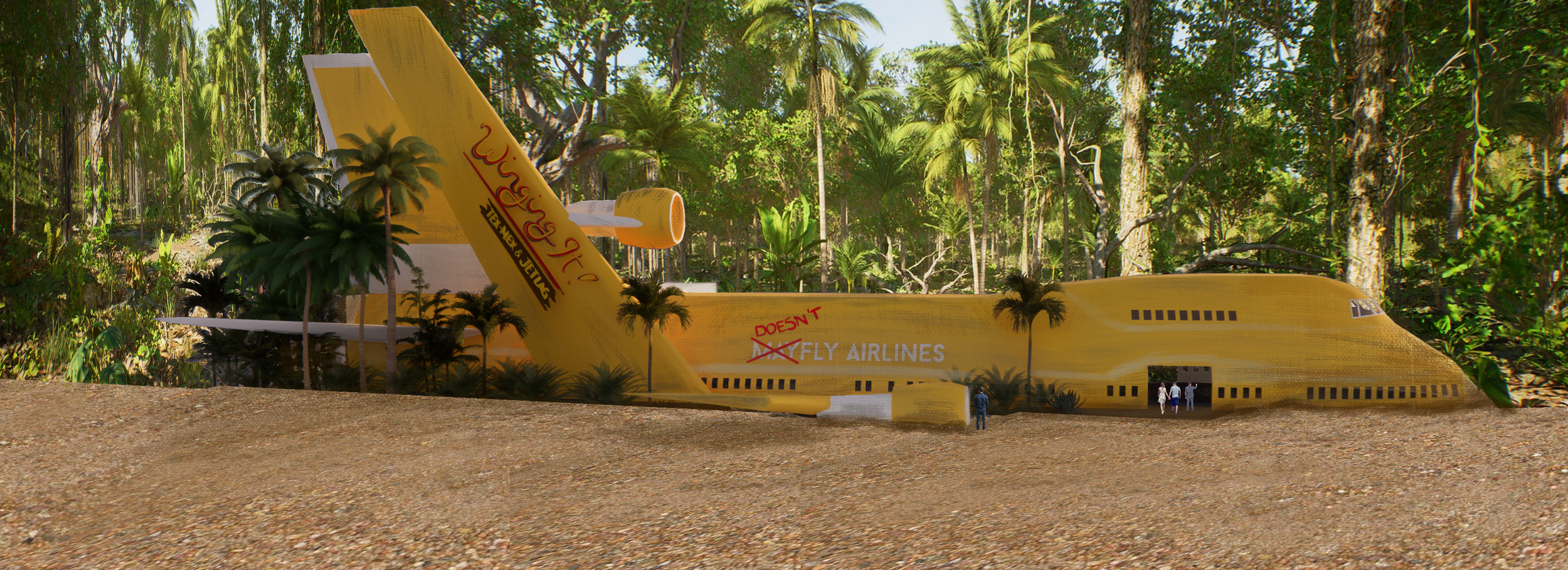 “Winging It” is a 1970s-set immersive Tex-Mex restaurant housed inside a crash-landed jumbo jet loosely modeled after a Boeing 747-200 Combi, where every passenger survived and collectively decided that starting a restaurant was far more productive than waiting for rescue. The fuselage remains entirely intact, preserving the original cabin structure as the main dining room, while the cargo bay… well, let’s just say it may be fossilized at this point. Guests can pose for photos inside one of the jet engines before “checking in” at a lobby desk constructed from stacked passenger luggage, and browse merchandise made from repurposed “lost belongings” before heading to our outdoor cockpit bar, where blinking instruments share space with tequila taps. The tone channels the straight-faced absurdity of disaster spoofs like Airplane! and the playful guest interaction style of Dick's Last Resort, brought to life through over PA announcements, mock airline protocol, and a recurring “Rescue Attempt” event staged roughly every one to two hours, in which diners are prompted to make as much noise as possible to attract would-be rescuers, who inevitably fly right past. “Winging It” is a warm, self-aware survival fantasy where the crash is old news, the margaritas are strong, and the crew is fully committed to making this layover permanent.